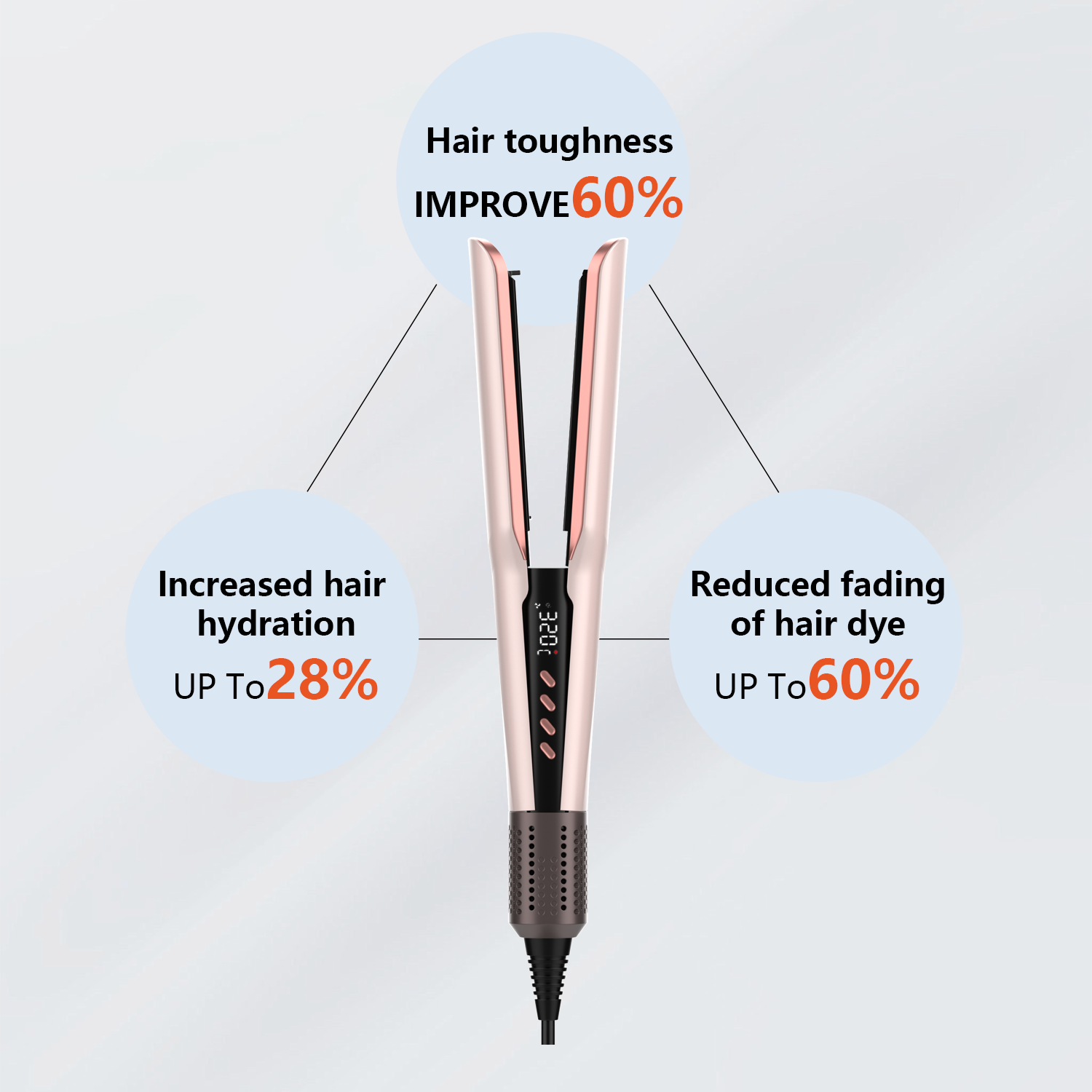 Unlike traditional styling tools, our hair styler uses negative ion technology to protect and enhance your hair. Negative ions help break down water molecules faster, reducing drying time while sealing the hair cuticle to lock in moisture and shine. This minimizes frizz, static, and heat damage, leaving hair smoother, softer, and healthier-looking. In contrast, hairstylers without negative ion technology can strip moisture from the hair, causing dryness, frizz, and long-term damage with repeated use. The result is a noticeably gentler and more effective styling experience.